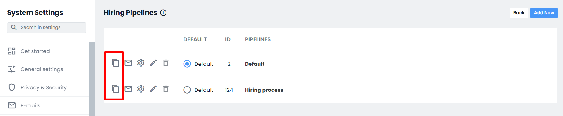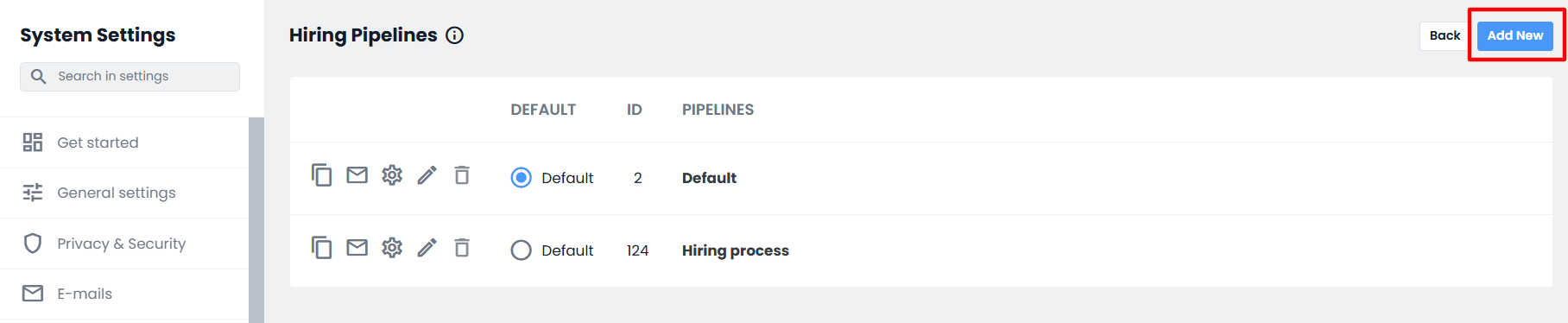 On this screen, you can create new Pipelines (based on the limits set by your In-recruiting plan) by clicking on the "Add new" button at the top right or by duplicating one of the Pipelines already available, by clicking on the dedicated icon.