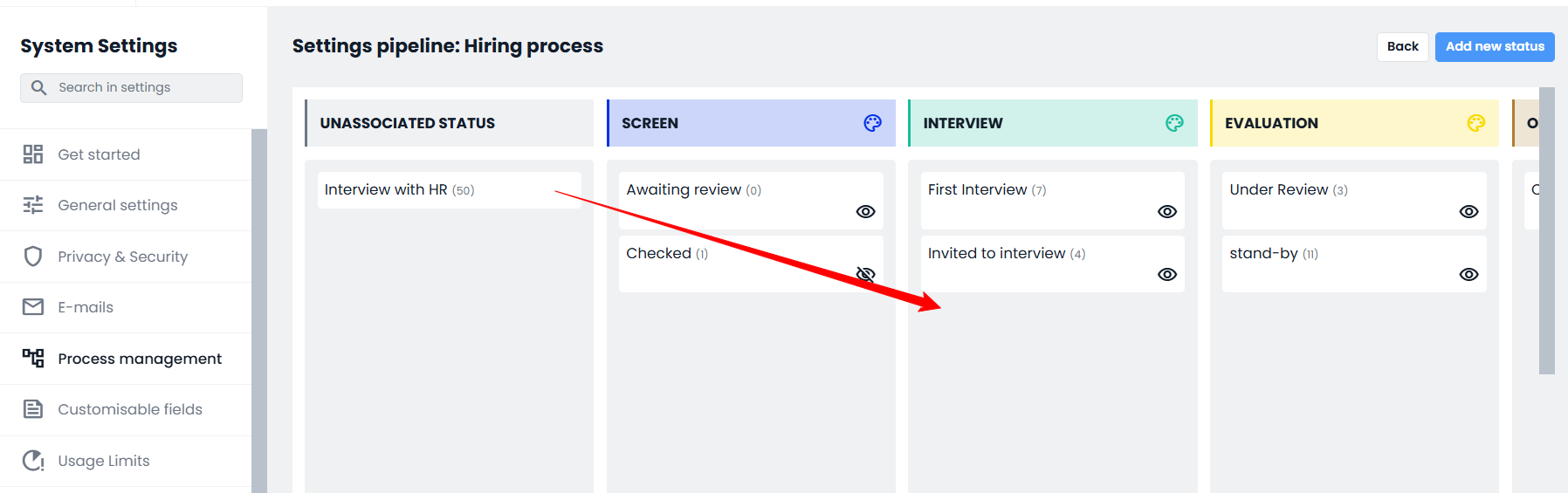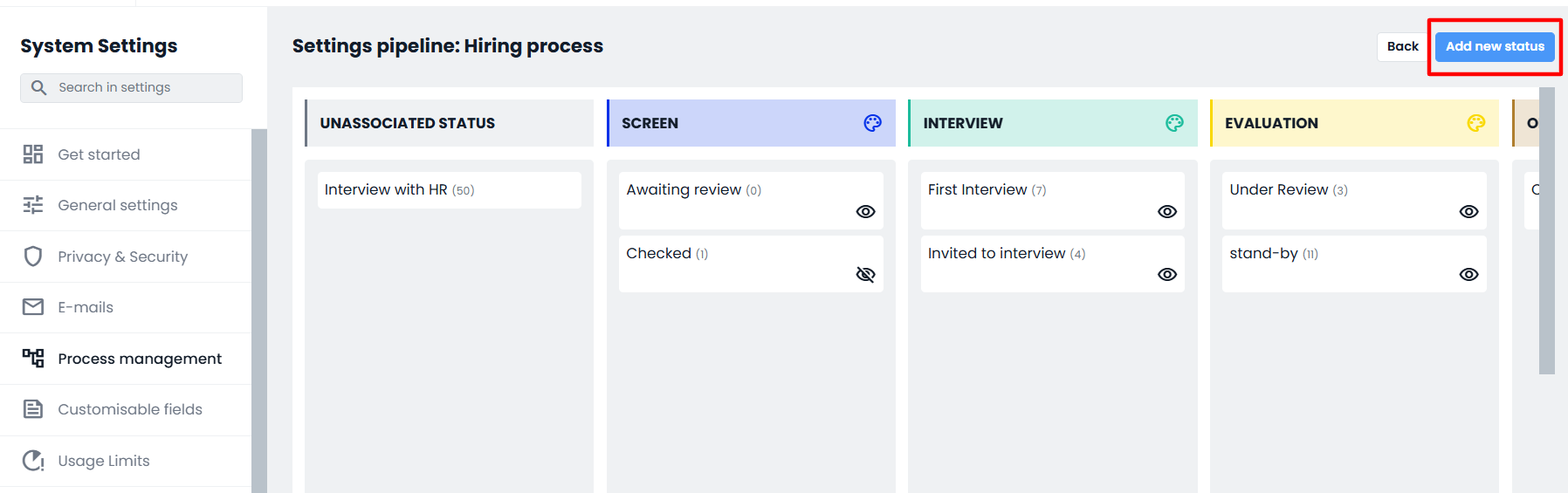 It is also possible to create new "Application status" from the Hiring Pipeline by clicking the “Add new status” button located at the top right.