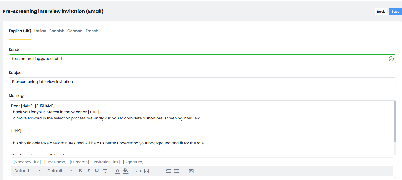 Note: You can customize the default message from System Settings > E-mails> Vacancies > Pre-screening interview invitation (Email)