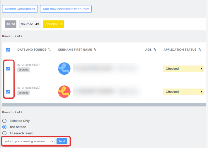 Manual invitations can be sent directly from the “Applicants” tab in the vacancy detail page, where you can select one or more candidates registered to the vacancy and then click on “Invite to pre-screening interview” located in the quick actions menu at the bottom of the page.
