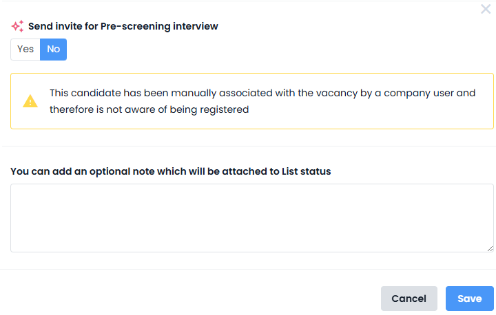 If the candidate was manually added (sourced) and you still decide to invite them to a pre-screening interview, the system will: