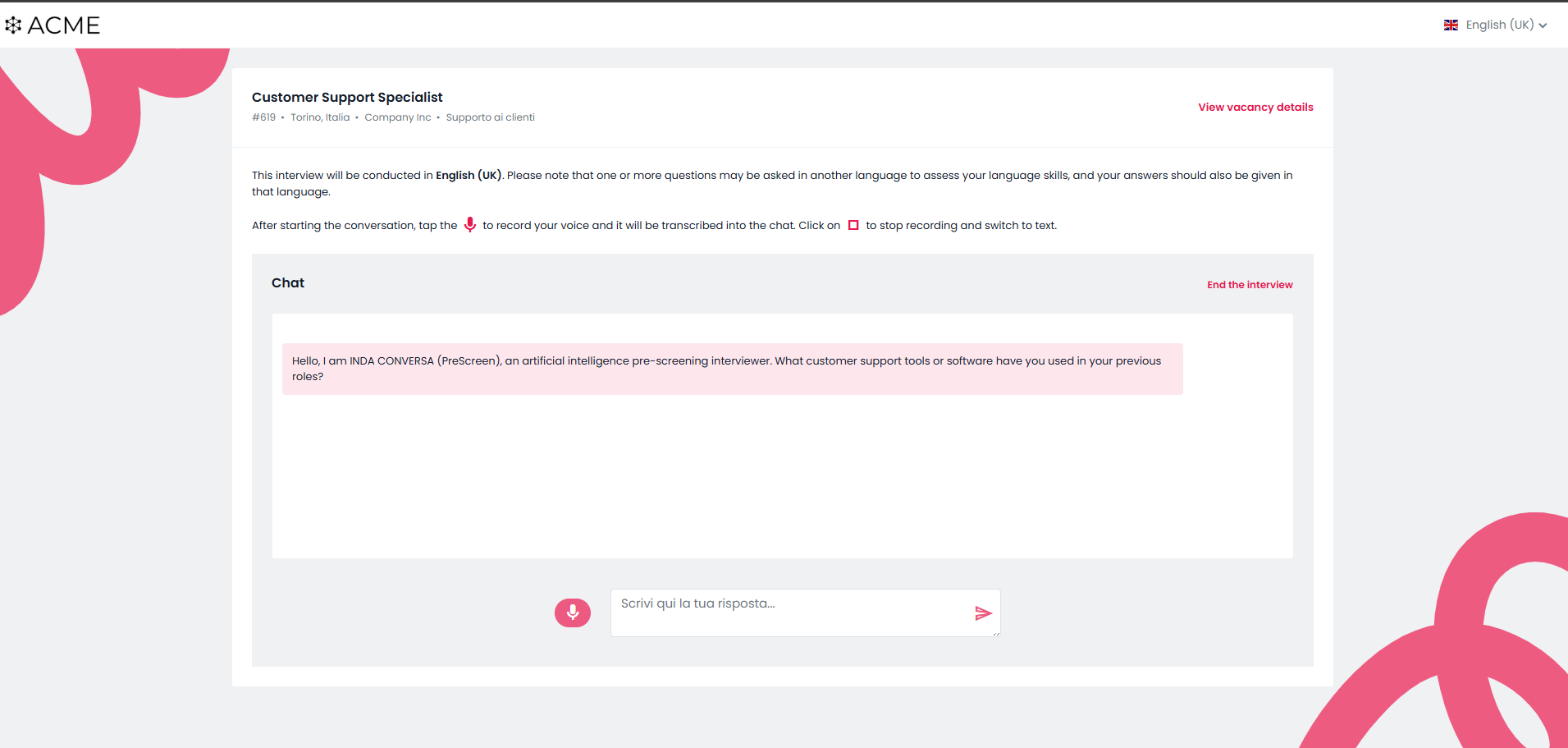 The pre-screening interview is conducted asynchronously through a conversational interface designed to allow the conversation to take place either in written form or via voice, depending on the candidate’s preference.
