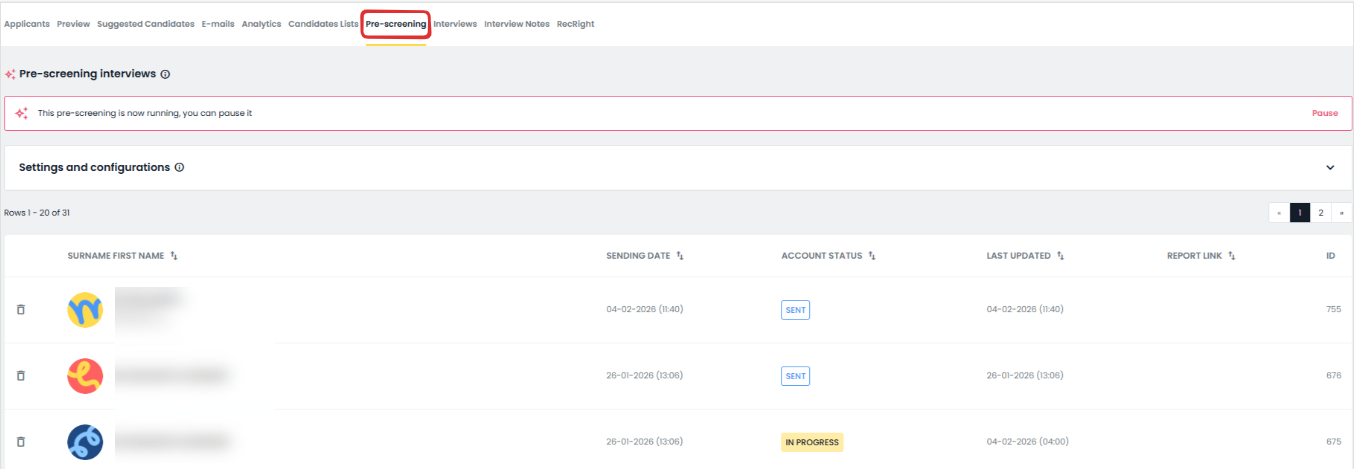 • In the vacancy details, a new “Pre‑screening” tab appears, providing the list of invited candidates and those who have completed the interview, with direct access to the report when available;