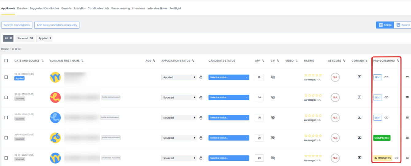 • Candidates highlighted in red are those who have already received an invitation or have already completed a pre‑screening interview, unless the previous interview has been invalidated.
