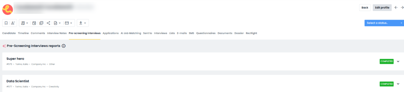 • In the candidate’s profile, a dedicated tab is available, collecting the history of completed pre‑screening interviews along with their respective reports.